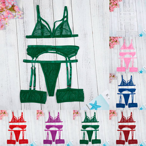 3pcs Ladies Sexy Solid Sensual Lingerie Set Mesh Underwear Women Push Up Bra Garters Brief Sets Transparent Blue Bra