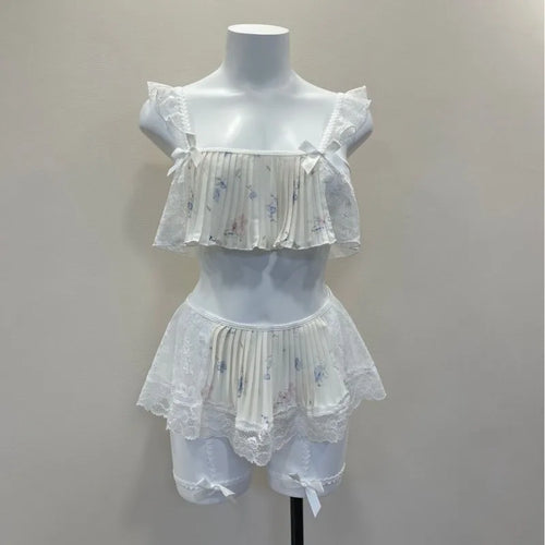 Sexy Underwear Strapless Bra & Brief Lingerie Three-piece Set Women's Pajamas Silk Lace Ruffles with Chest Pad Floral Printing