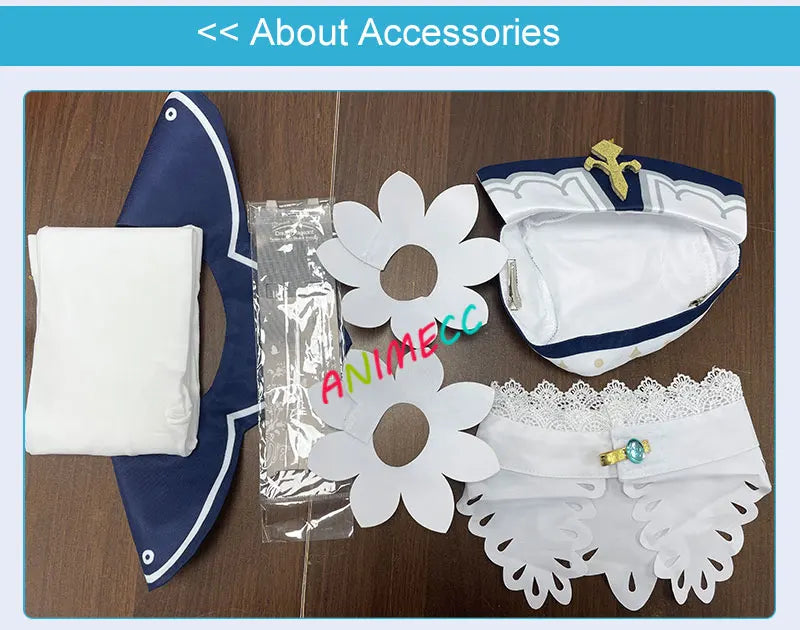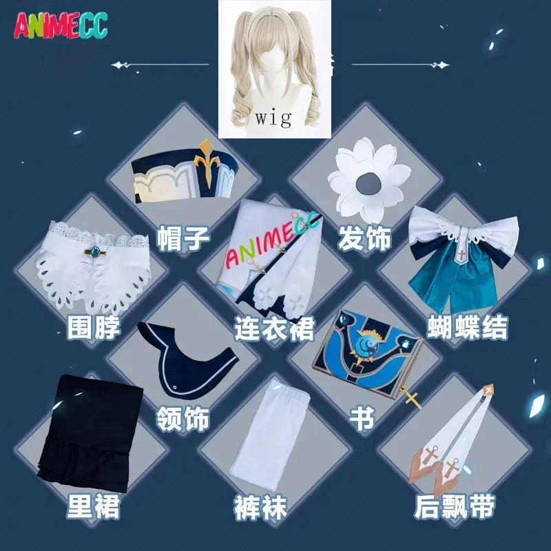 Barbara Cosplay costume include:Dress+Skirt+Bow+Hairwear+Neckwear+Hat+Scoks+Belt+Book