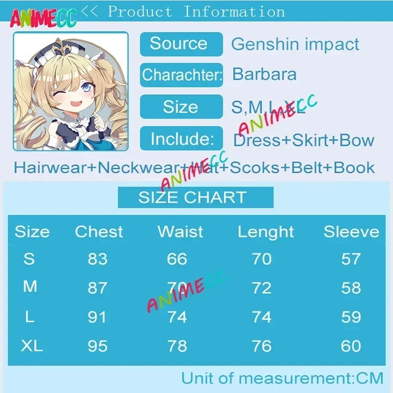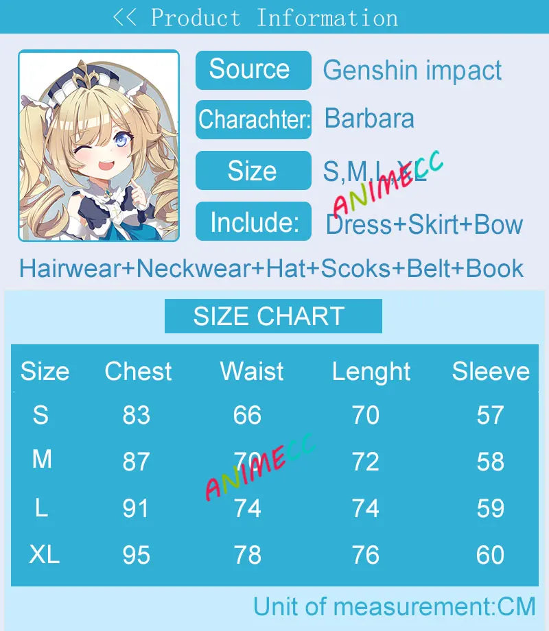 tips:Barbara Cosplay costume not include wig and shoes,if you want wig,please order costume and wig,The clothes will give a bustle,and now The bow of the collar is green.